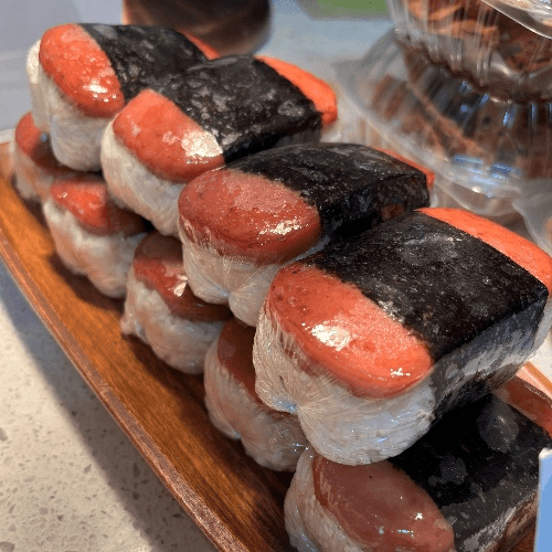 A famous Hawaiian snack. Marinated spam over rice, wrapped together with nori.