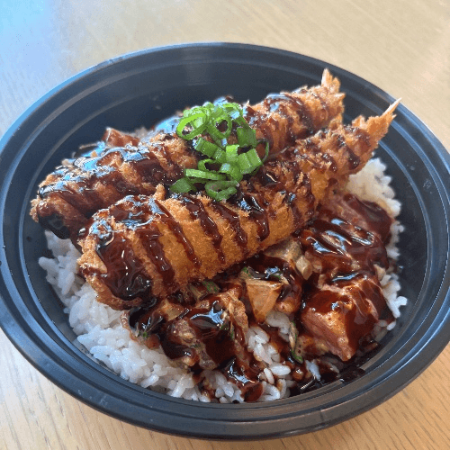 Spicy Ahi Poke topped with 2 pieces of Shrimp Katsu, unagi sauce, bubu arare, and green onions.