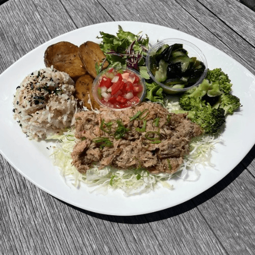 1 base, 2 poke, 2 sides, kalua pork, and Hawaiian sun drink